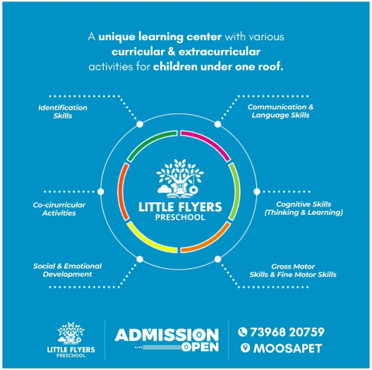 Located in the heart of Moosapet, Hyderabad, Little Flyers Preschool offers a secure and welcoming environment for your child. Our campus is set in a peaceful neighborhood, easily accessible from major areas such as Kukatpally, Bharat Nagar, and Miyapur.